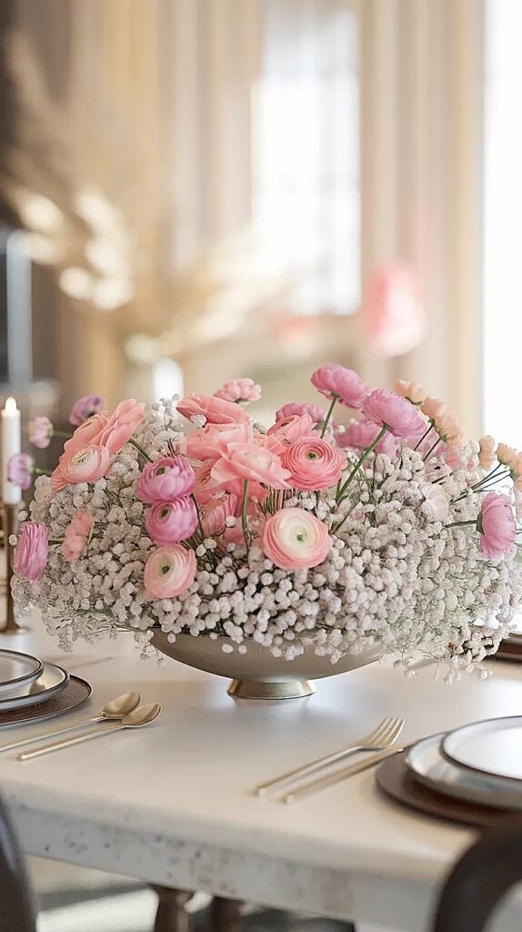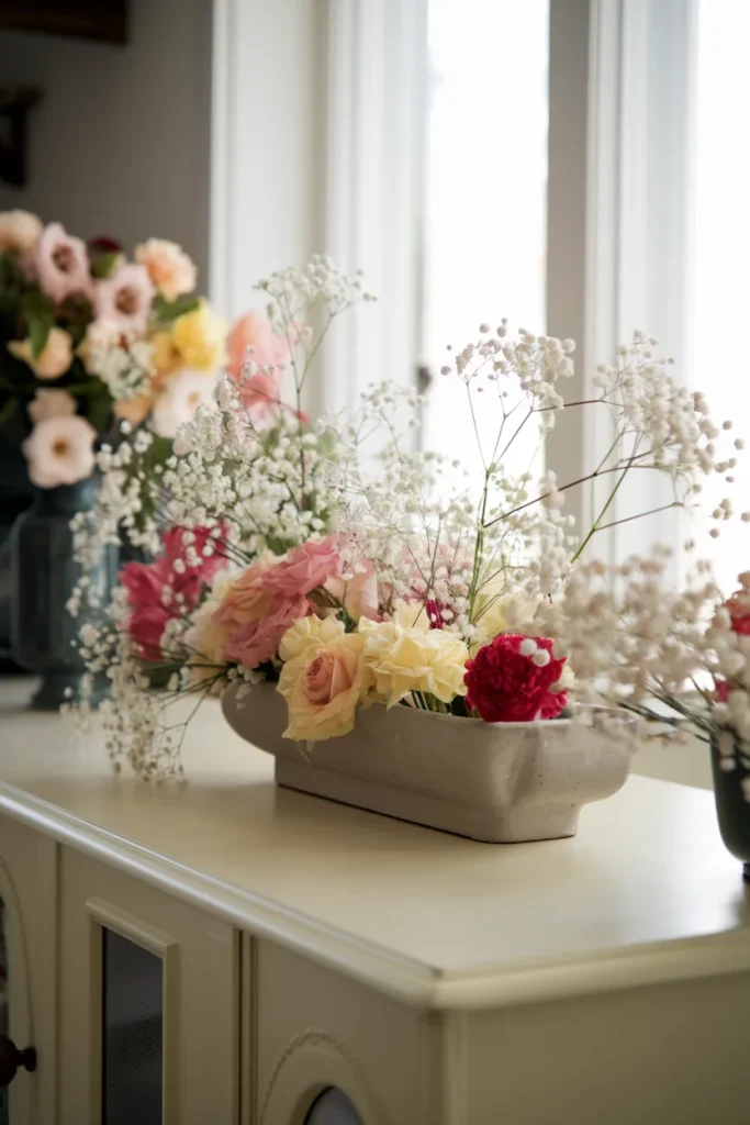 Coffee tables demand arrangements that look full and beautiful while preserving the surface’s actual function, holding drinks, remotes, books, and phones. Baby’s breath excels here through its ability to create visual abundance in shallow vessels without claiming vertical or horizontal space people need.
