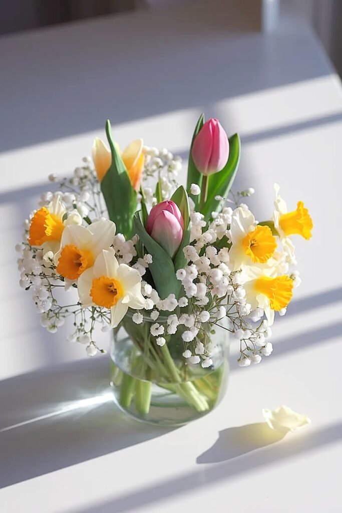 Daffodils’ cheerful yellow combined with baby’s breath’s white creates quintessential spring palette suggesting deliberate seasonal styling. The trumpet daffodil forms contrast baby’s breath’s tiny clustered blooms creating bold-versus-delicate contrast. Buy daffodil bunch ($8-10) and baby’s breath ($5-7) totaling under $17. Use 8-10 daffodils nestled in baby’s breath clouds. The yellow-white combination feels fresh and optimistic. The pairing works indoors or outdoors through both flowers’ sturdy weather-resistant nature.