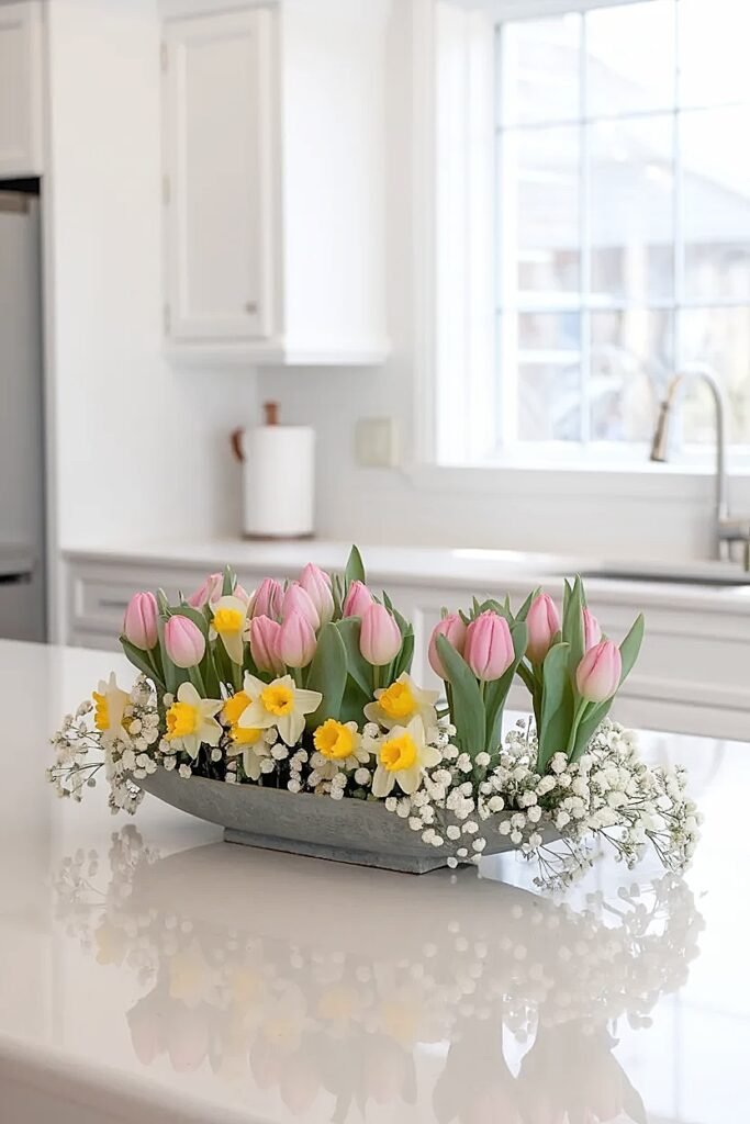 Position 16×6 inch trough along island’s back edge filled with baby’s breath base layer supporting 6-8 focal flowers creating linear installation preserving front prep space. Use half bunch baby’s breath creating generous foundation with tulips or carnations rising above. The narrow 6-inch width claims minimal island depth while 16-inch length creates meaningful presence. The baby’s breath extends arrangement’s perceived width through outward branching while actual vessel stays compact. Total cost under $18.