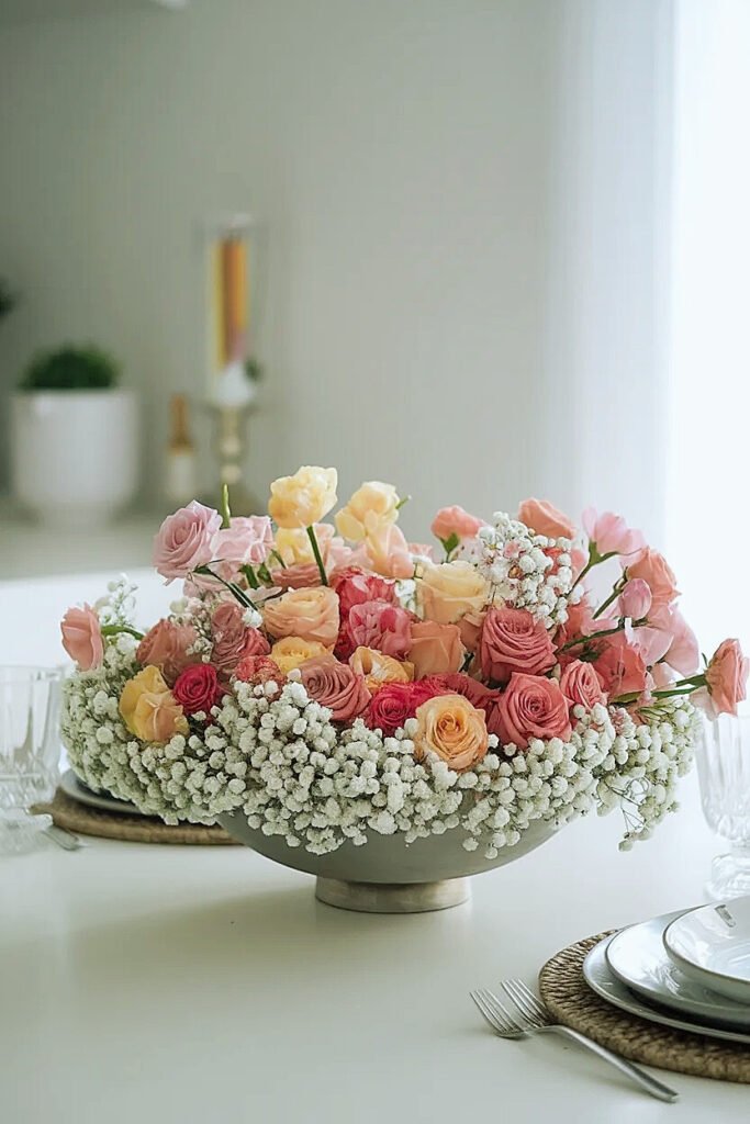 Position baby’s breath exclusively around arrangement’s outer perimeter creating continuous ring encircling focal flowers, angling stems outward so blooms extend beyond bowl rim forming cloud collar. Use 8-10 baby’s breath stems creating generous perimeter coverage. This wrapping technique frames central focal flowers making them appear more important and expensive through the baby’s breath halo effect. The outward angling extends visual boundaries beyond vessel itself. Works brilliantly in 10-14 inch bowls where perimeter treatment creates substantial presence.