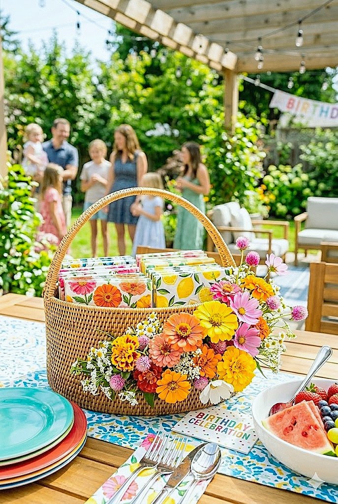 Decorating a backyard party shared napkin basket with summer flowers is one of those ideas that seems too simple to bother with until you see it done well. A napkin basket sits on the edge of the buffet table or the drink station, gets reached into by every single guest at the party, and is almost always styled as a purely functional object: a basket full of napkins, nothing more. Adding one small flower element to it transforms it into a detail that communicates that the party host thought about every surface, not just the main table.