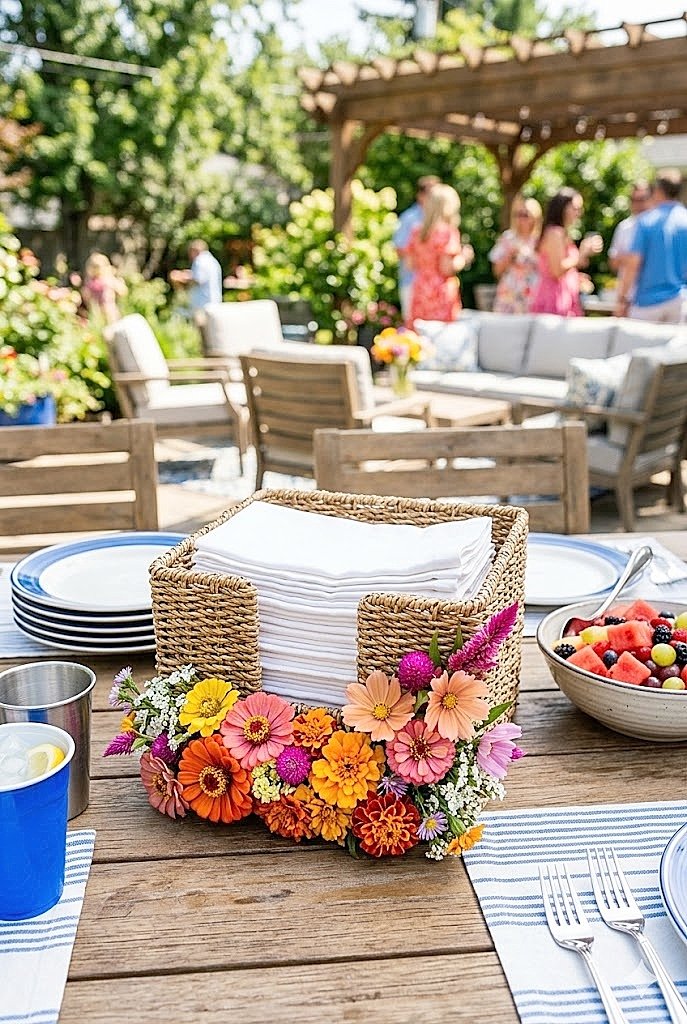 Ways to Use Budget-Friendly Summer Flowers on a Backyard Party Shared Napkin Basket