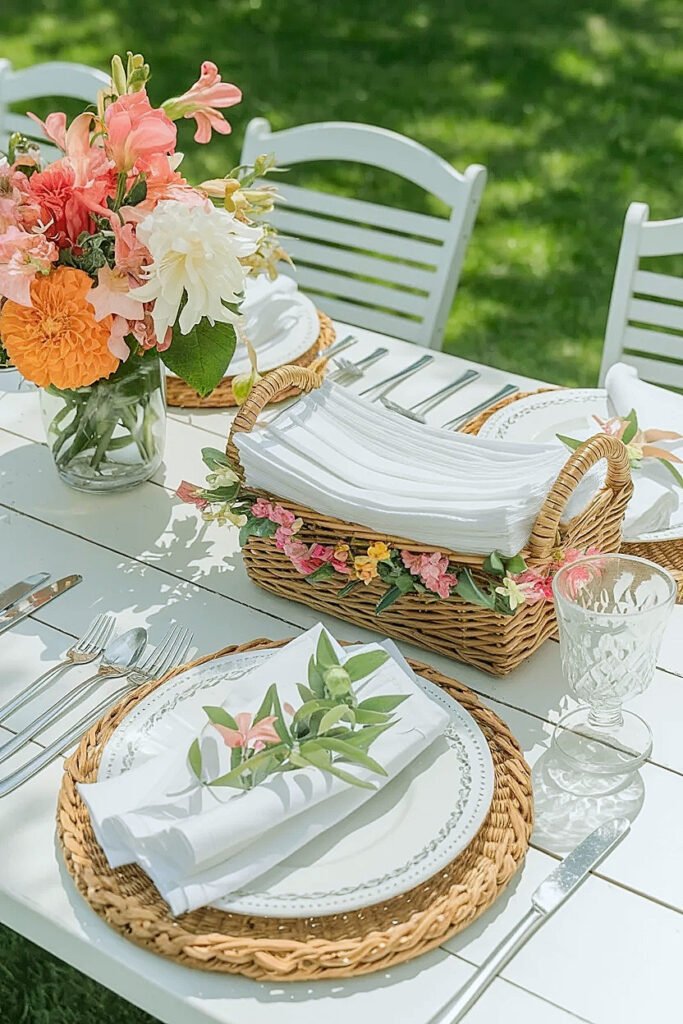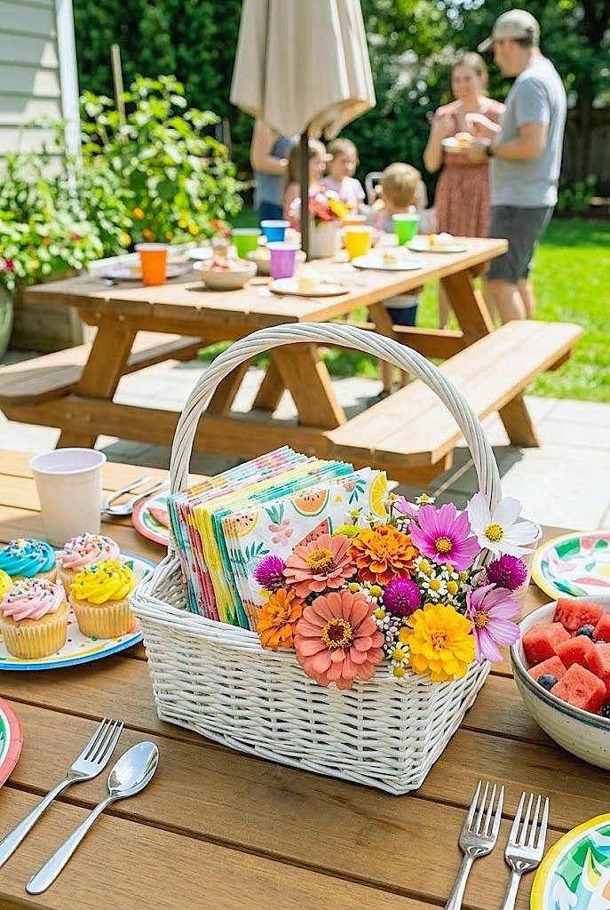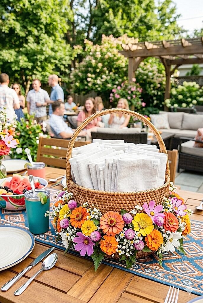 Decorating a backyard party shared napkin basket with summer flowers is the detail that takes the buffet station from functional to finished. One stem tucked into the front weave, one jar clipped to the handle, one marigold face at rim height: the scope is small, the impact is genuine, and the skill required is essentially zero.