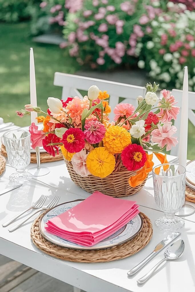 Zinnias, marigolds | Rounded blooms add bright cheerful color without needing much height. | Use one small floral grouping instead of wrapping the whole basket so napkins stay easy to grab. |