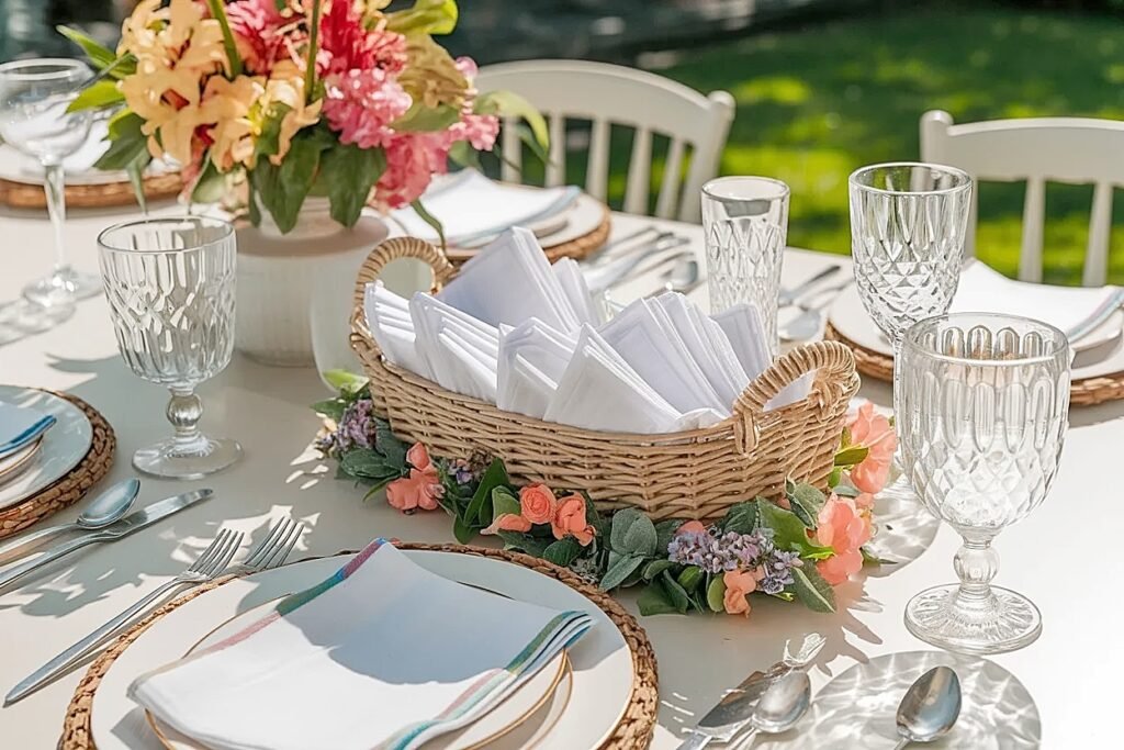 One technique I use that surprised me with how well it works: coordinate the napkin color with the flower color. Mustard yellow napkins with a marigold tuck, white napkins with a white statice spray, coral linen with a coral zinnia. The color echo between the napkin stack and the flower element makes the whole basket read as one designed detail rather than a practical object with a flower attached.