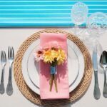 The shared napkin basket is also uniquely low-risk as a flower placement. Unlike centerpieces or flatware bundles, the flower here does not need to hold for hours without water or survive direct handling by guests. It sits beside the napkins, not among them, and can be refreshed during the party without anyone noticing. That makes it an ideal placement for slightly more delicate flowers that might not survive a two-hour stint in a flatware bundle.