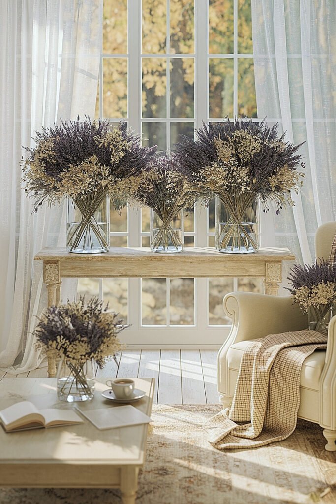 Keep sightlines low. I fan wheat horizontally along a slender runner, allowing lavender to arc like cursive between the straw. The contrast—straw matte against lavender’s cool bloom—reads rustic and refined at once. If the room runs warm (lots of brass and terracotta), add a whisper of dusty miller to cool the palette without stealing the harvest story.