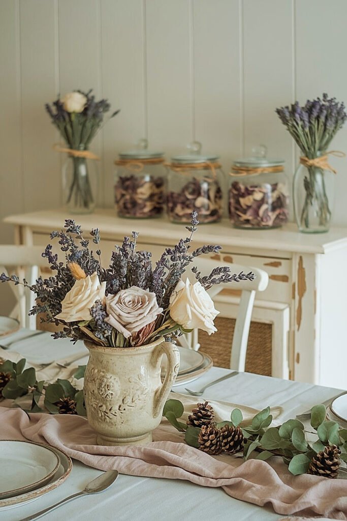 Smaller heads deliver repetition and rhythm without overwhelming space. Mauve tones make lavender feel deliberate, not accidental. I cluster three mini heads with one lavender bundle to form a “unit,” then repeat those units every 10–12 inches in garlands or along a runner. This modular approach keeps the composition tidy and easy to edit before guests arrive. - Dried White Rose (Ivory/Vanilla):