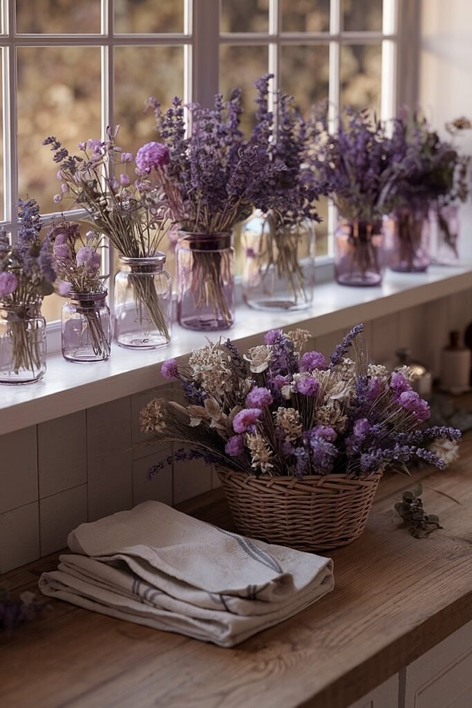 Use hydrangea as shallow wedges around a thin olive/lavender wreath. Place wedges at 10 and 2 o’clock; run lavender like a horizon line across the lower third. This composition feels modern and balanced. - Windowsill Trio: