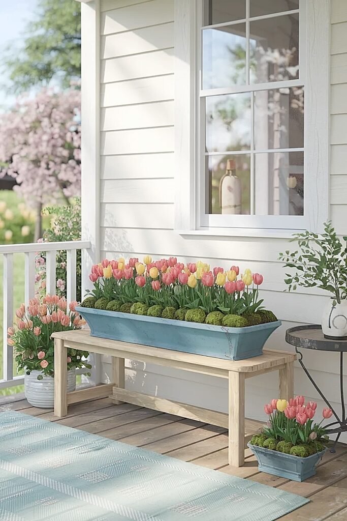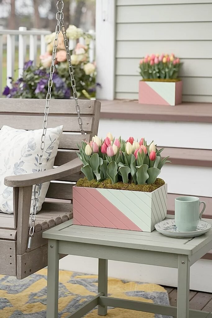 Ways to Color Band Spring Tulips in Porch Swing Side Table Planters