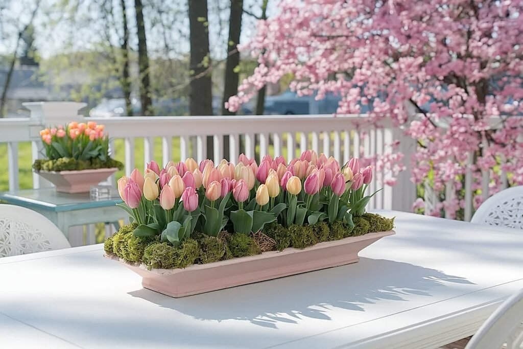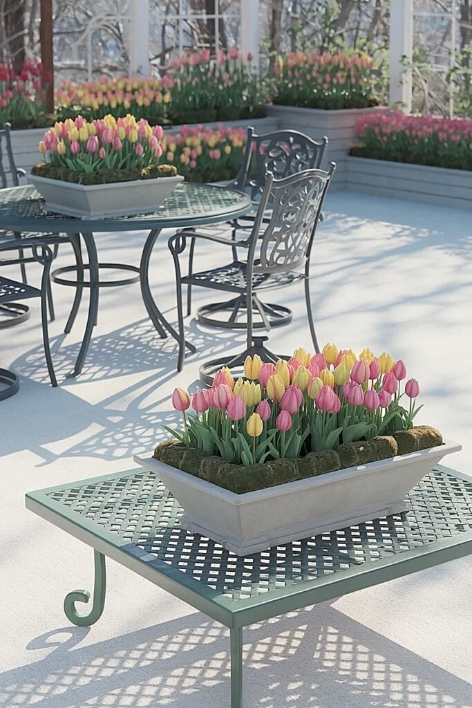 Ideas for Color Banding Spring Tulips Across Multiple Outdoor Tables for a “Full Patio” Look