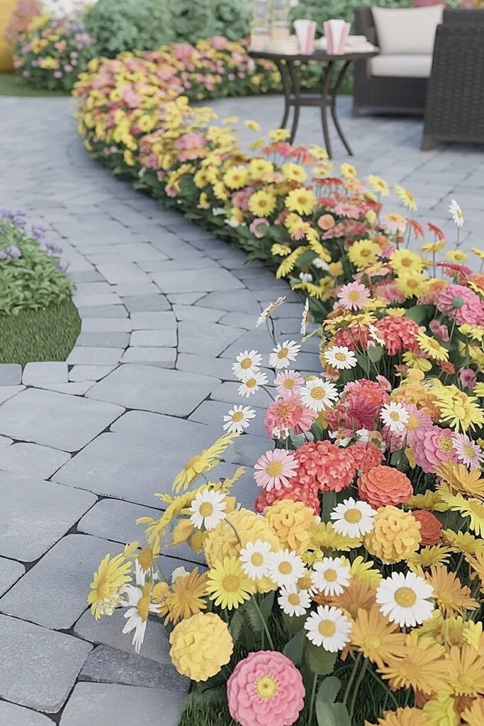 Low slim bursts | Daisies, zinnias, marigolds, gomphrena | Keep the flowers just outside the path line so the walk stays clear. |