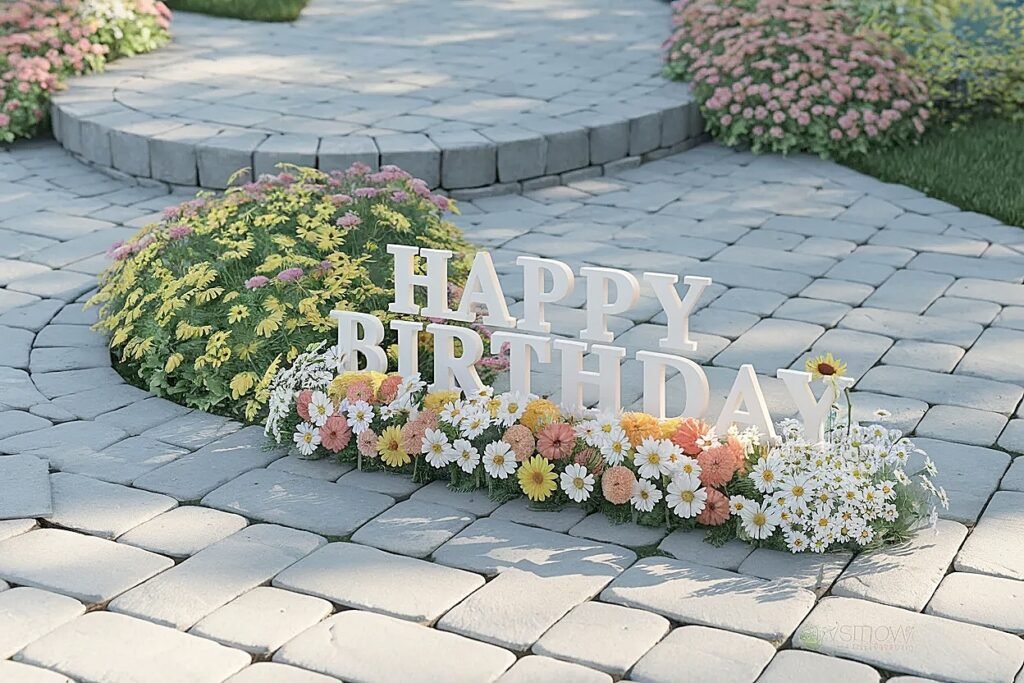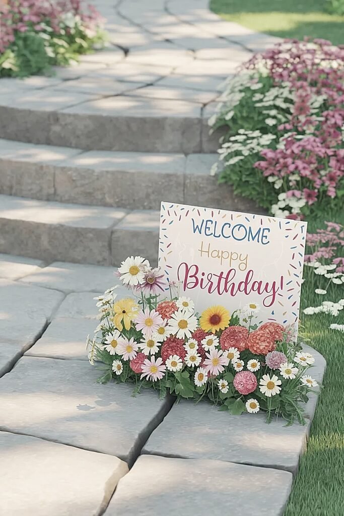 A birthday sign at the entrance to the walk-up area is the focal point that guests see first from the street or yard. The flowers that flank it have to complement the sign without competing with it and hold their visual presence from a distance that is often fifteen to twenty feet before guests are close enough to read the sign text. That distance changes the design calculus completely.