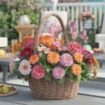 3. Corner Basket or Crate at Path Terminus At the point where the walk-up path arrives at the patio or party space, place one substantial flower display in a wicker basket, wooden crate, or large galvanized tub as a visual full stop to the arrival sequence. This position marks the transition from approach to party. Make it the most generous arrangement in the.