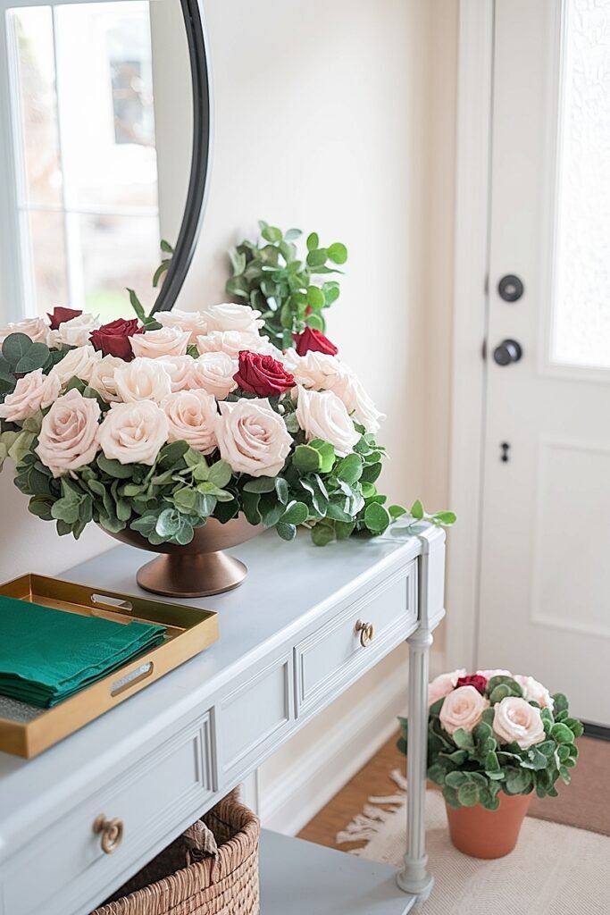 For the arrangement itself, leverage the climate-controlled environment by selecting delicate rose varieties that wouldn’t survive outdoor exposure. Tea roses, rare green varieties, and fragrant garden roses all thrive indoors where temperature and humidity remain stable. Add mirrors above your console to double the visual impact of your roses through reflection, the mirrored repetition makes modest arrangements appear more substantial. Incorporate lighting elements like candles or small lamps to highlight your roses during evening hours when natural light fades. Layer with greenery, books, framed Irish blessings, or collected objects that reflect your personality. Console displays allow complexity that weather-exposed positions cannot sustain. But sometimes simplicity outperforms complexity, a single statement pot done perfectly creates impact nothing else matches.