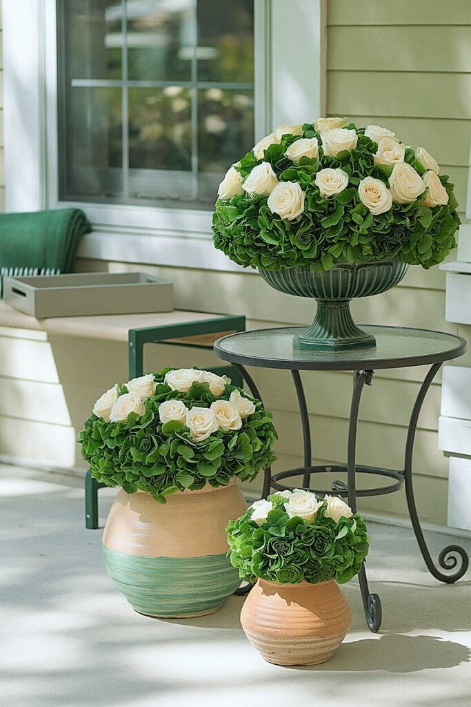 4. Ombré Effect Cluster Paint five to seven small pots in graduating shades from pale mint to deep forest green. Cluster them together on your porch, each holding a single rose or small spray. The gradient effect creates visual interest while the cluster fills space abundantly. The variety of green shades adds depth that single-color approaches cannot achieve.