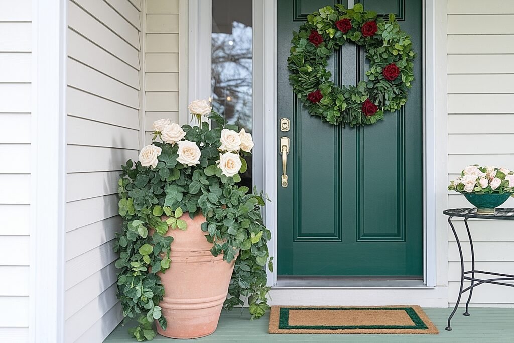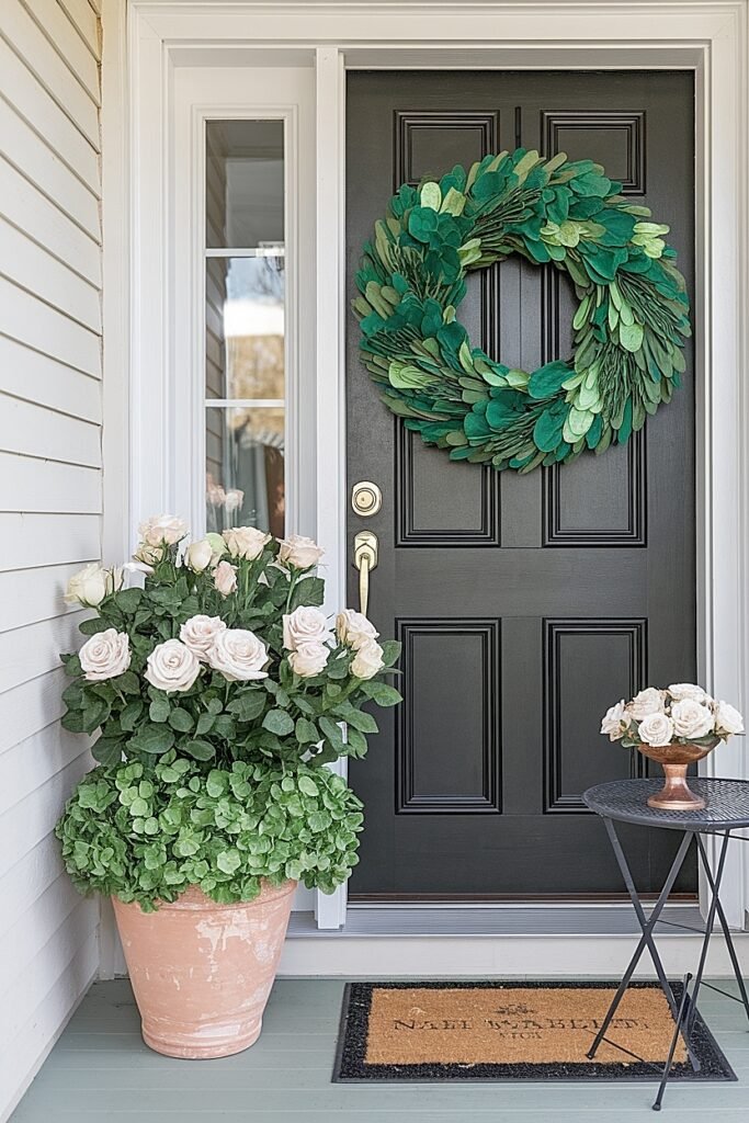 1. Flanking Door Guards with Matching Emerald Pots Paint two large terracotta pots in identical emerald green and position them flanking your front door like sentries. Fill each with abundant green and white roses rising from beds of moss. The symmetrical placement creates formal elegance while the matching pots establish clear design intention. The door-framing effect makes your entry feel grand even if your actual porch is modest in size. Ensure pots are heavy enough to resist wind or weight them with stones.