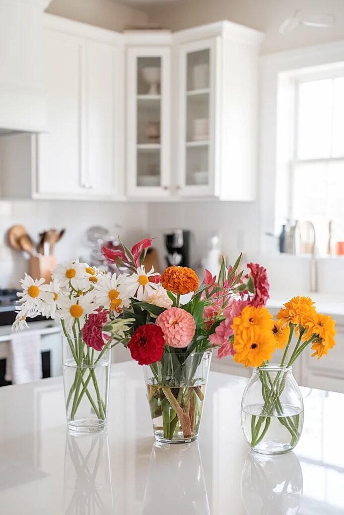 1. Three-Vase Gradient Run Buy one bunch with a natural color range, like mixed zinnias from pale yellow to deep coral. Separate blooms by shade and place three small vases in a line, lightest on one end and deepest on the other. Cut stems to the same short length so each bloom sits just above the vessel rim. The gradient reads as intentional and sophisticated, holding together visually from anywhere in the kitchen.