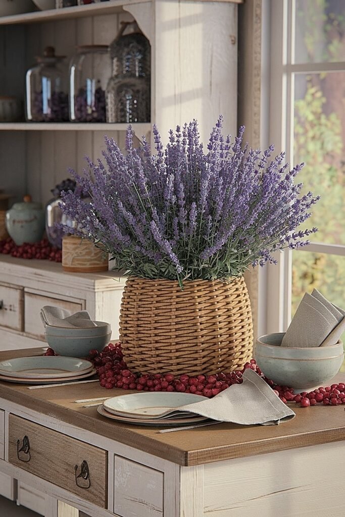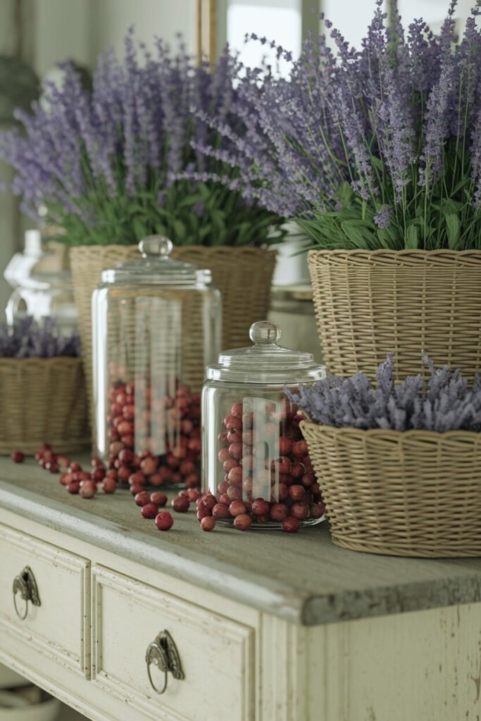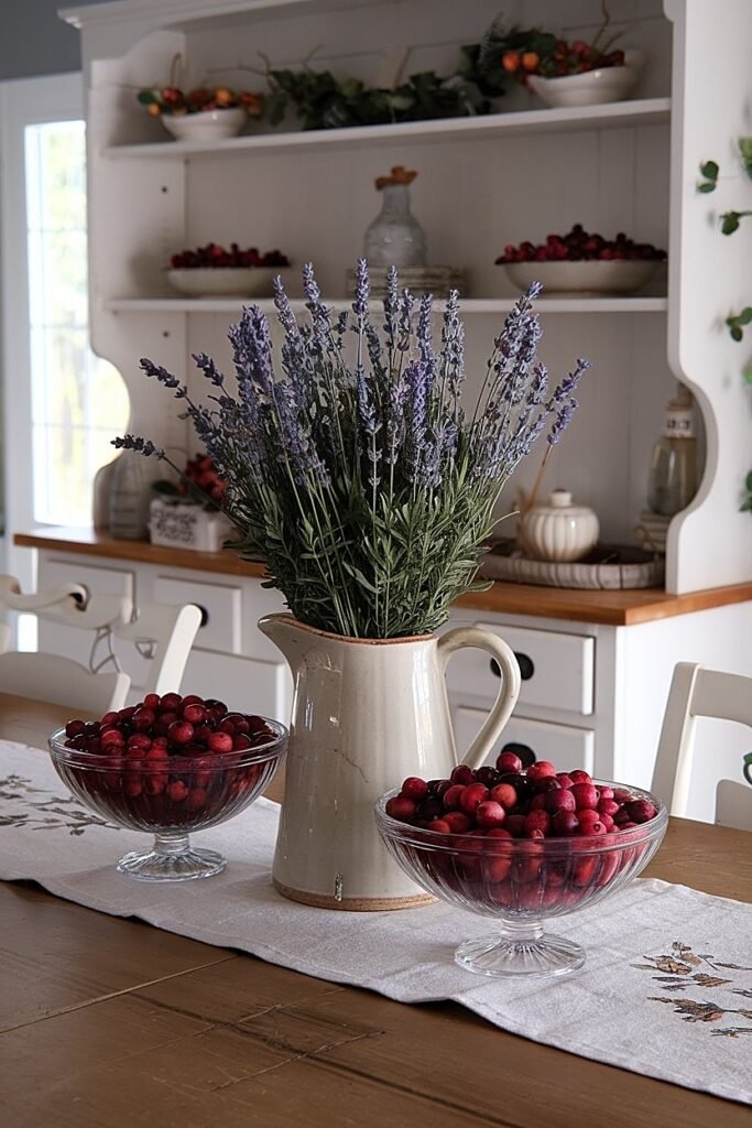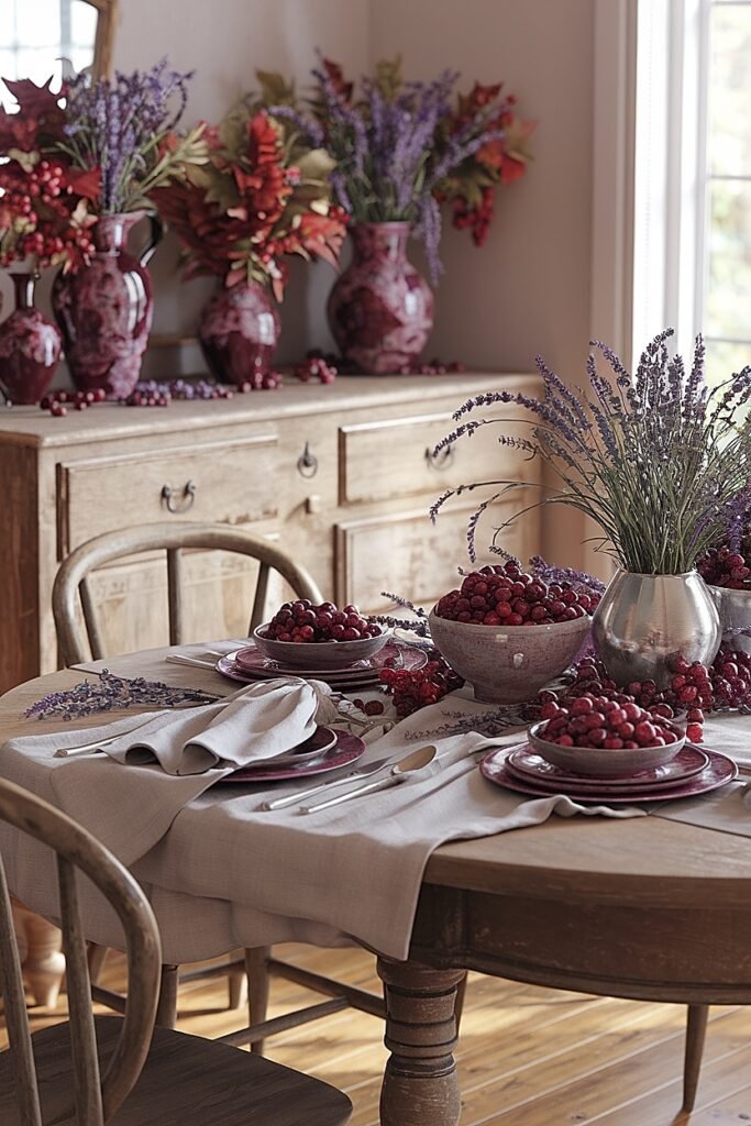 Ways to Decorate Farmhouse Thanksgiving Sideboards with Lavender and Cranberries