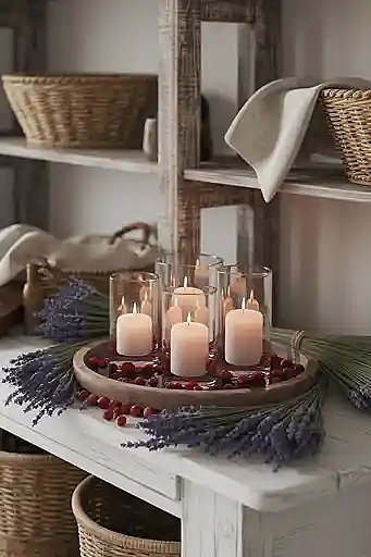 Beneath a mirror, seat a shallow bowl of cranberries on a mercury coaster; run a slim lavender garland along the shelf edge. The reflection doubles color while lavender tames the shine. - Stoneware + Sprig Stacks: