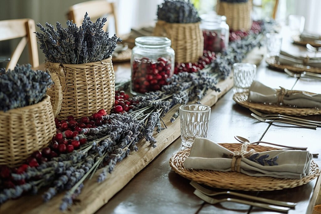 Lavender and cranberries thrive when each does its job. Lavender draws line, lends fragrance, and connects zones; cranberries provide saturated, seasonal color in small, controlled doses. Keep everything low, wired, and contained. Standardize ribbon and metal, corral elements on trays and in wicker baskets, and park candlelight where it flatters without competing with food. Garlands stay shallow, centerpieces stay conversational, sideboards stay mobile, and favors stay useful. Do that, and the room feels composed, generous, and unmistakably yours—quiet herbal calm threaded with celebratory red that looks beautiful in daylight and unforgettable by candlelight.