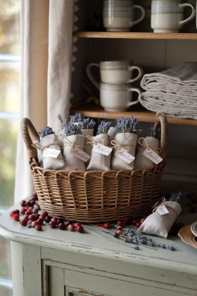 Hook a handled wicker basket under the edge, lined in linen, with mini lavender bundles and sachet favors. A cranberries-in-jar accent sits at the corner to nod to the palette without touching textiles.