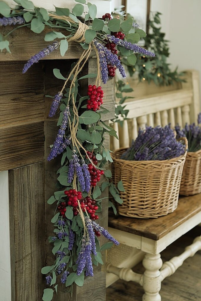 Garlands succeed or fail on mechanics. I build a slender base with olive or eucalyptus, tying with brown twine every 12–14 inches. Then I add wired 3–5 stem lavender bundles, staggered and angled consistently so the line flows one direction. Cranberries join as accents, not a continuous string, unless you’re working away from heat. If you do string them, use a heavy needle and waxed thread, then weave the strand just below the lavender arcs.