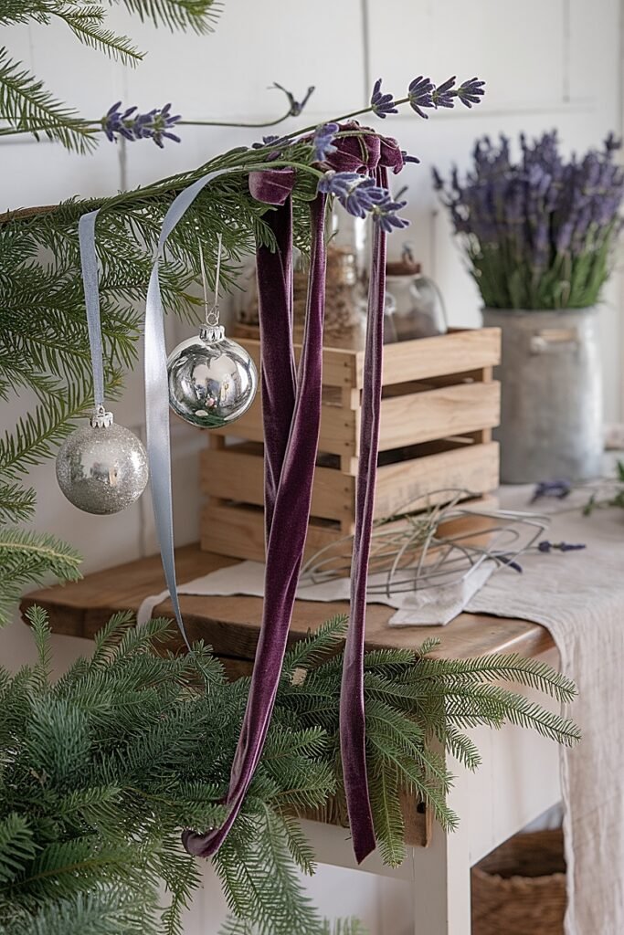 Where your garland turns a corner or meets a lantern, tie a layered bow: one strip of silver satin beneath one narrower velvet. Pin a five-stem lavender spray behind the knot so bloom peeks over ribbon, not in front. These junctions act like mile markers—visual rhythm that organizes long runs. Limit to three per room to avoid bow fatigue and let lavender remain the script that connects the dots. - Mini Posy Ornaments: