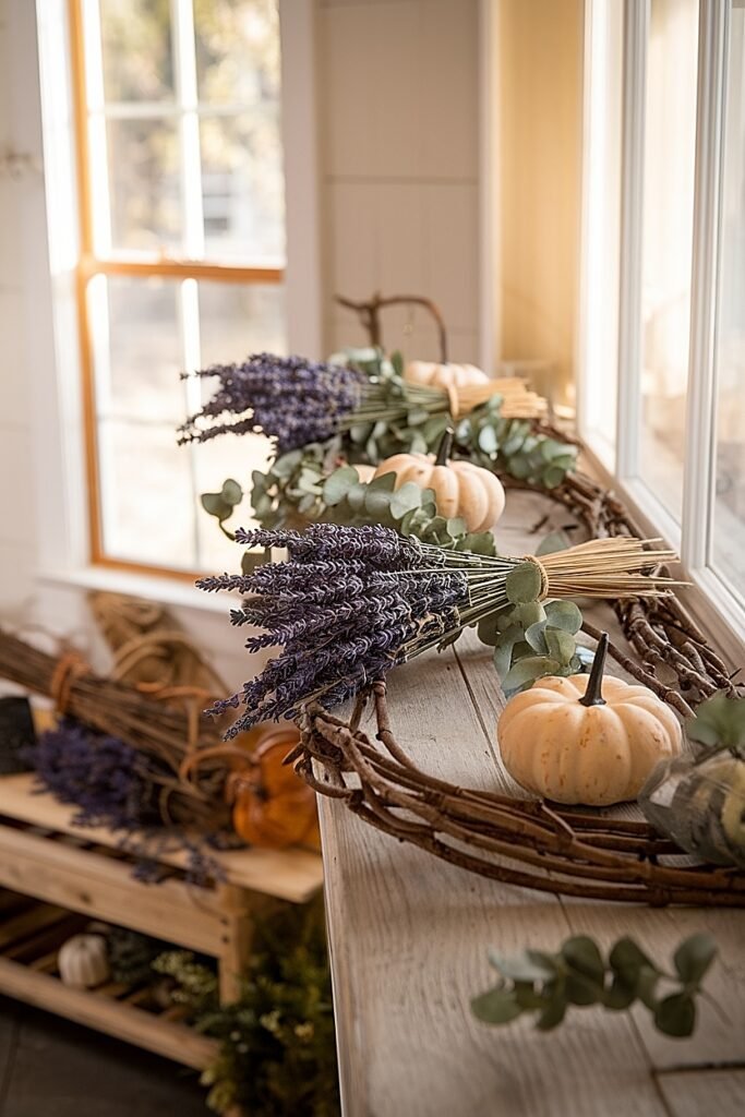Pumpkins bring weight and seasonality; lavender brings movement and scent. I park small to medium heirloom pumpkins (white, pale green, café-au-lait) at garland beats—center and ends for mantels; every 18–24 inches on tables. I collar each pumpkin with a micro-wreath of lavandin and a touch of olive so they feel stitched in, not plopped.