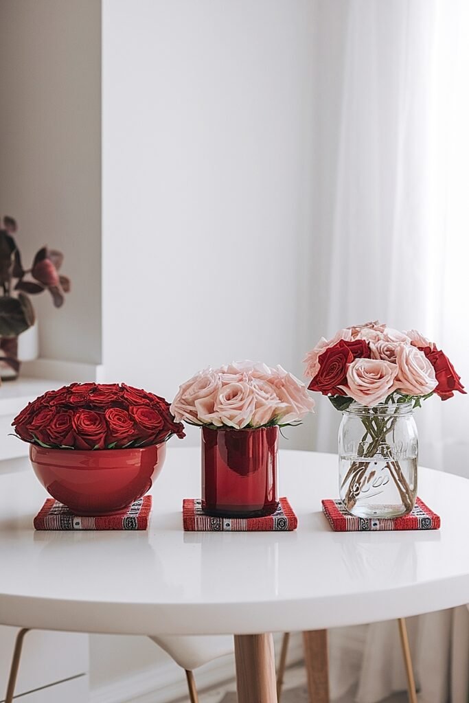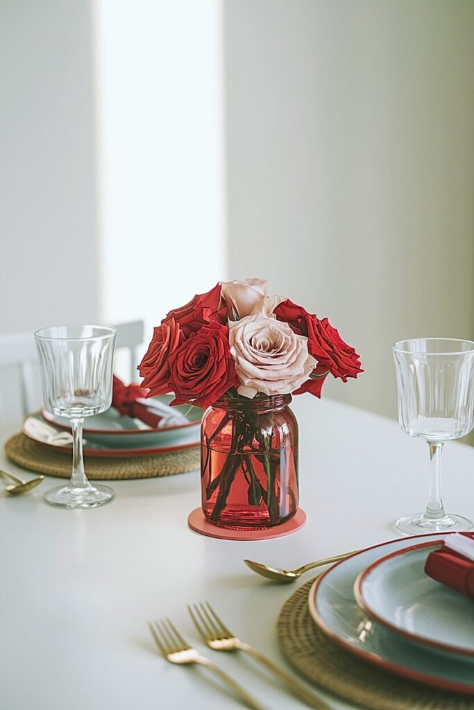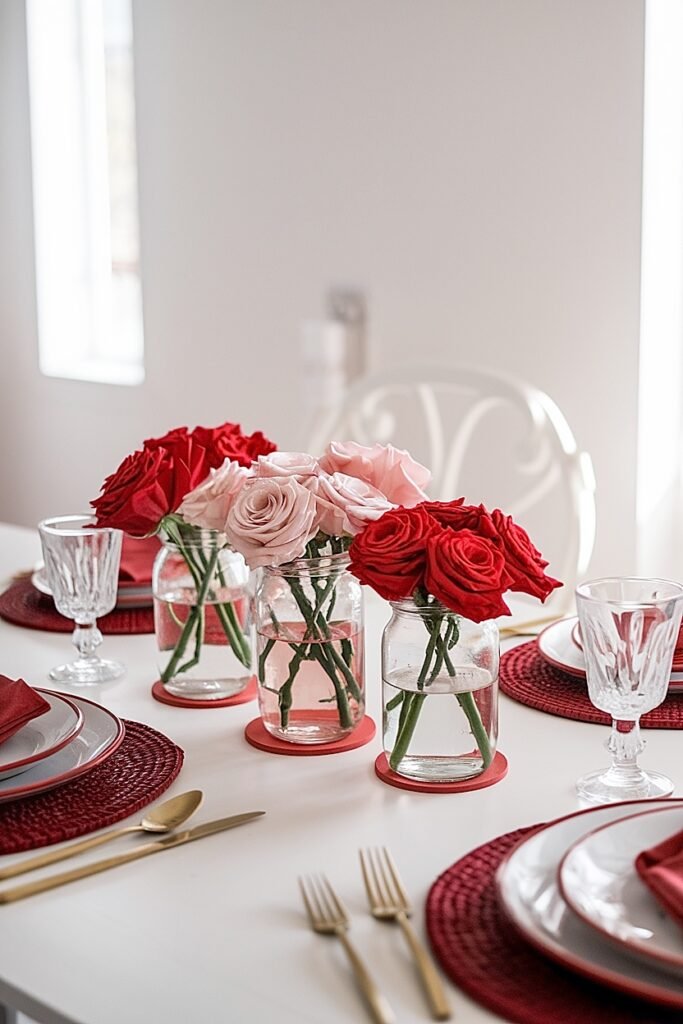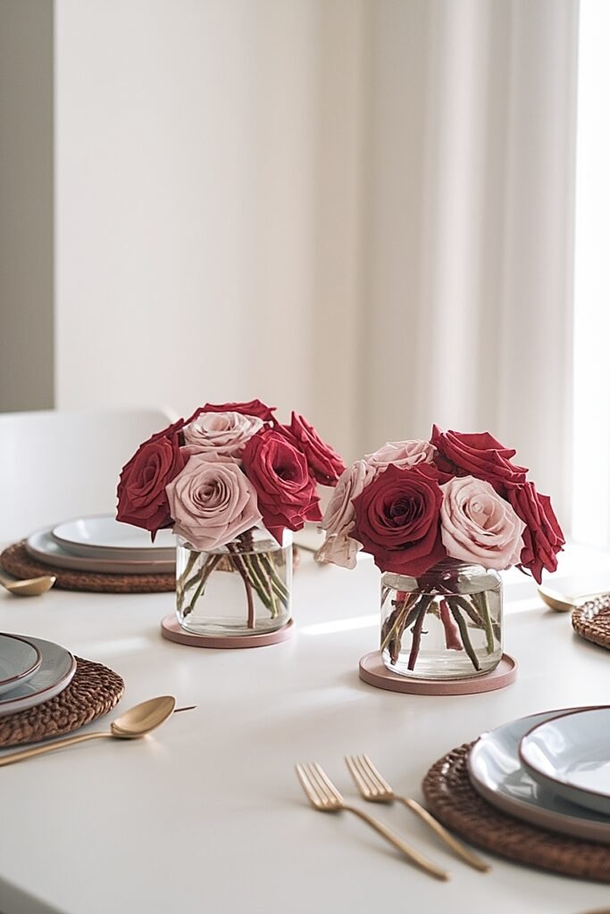 Create two identical arrangements using matching jars, same size, same rose count, same stem heights. Position at exact opposite table ends. The symmetry creates formal elegance while the duplication means neither arrangement needs to be large. Three roses per jar looks abundant when doubled across the table.