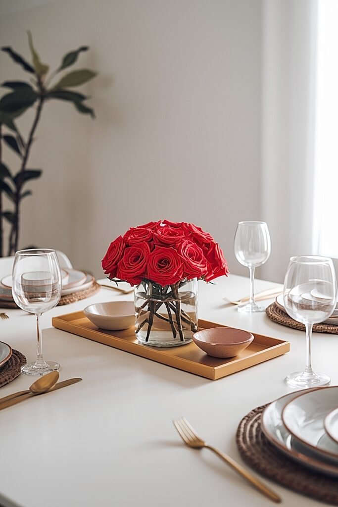 These approaches developed from that failed anniversary dinner and every corrected attempt since. The discovery that horizontal arrangements outperform vertical ones in intimate settings. The realization that tray bases add presence without height. The understanding that sometimes fewer roses, positioned strategically, create more romance than abundant flowers blocking the view. Your small dining table deserves Valentine beauty that enhances rather than obstructs the evening’s real purpose.
