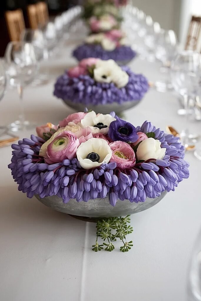 Built for low, wide centerpieces using Muscari as the cheap “gap filler” + “base layer” across tables, counters, kitchen islands, and more.