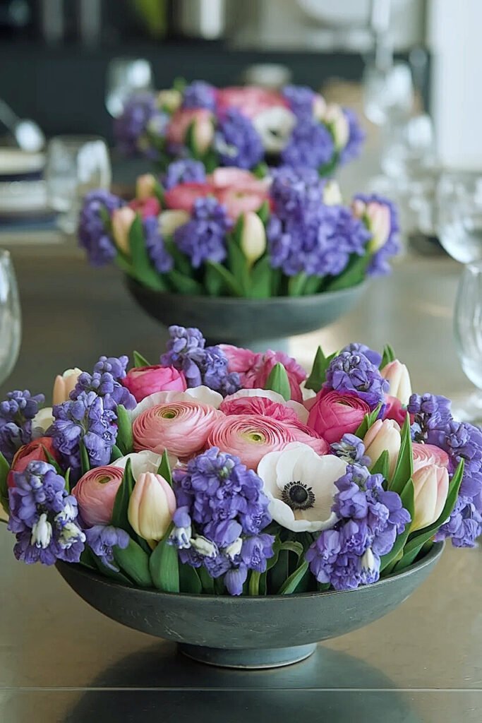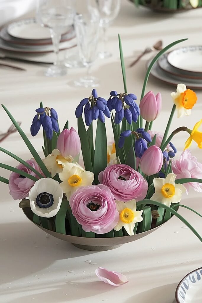 Fill bowl entirely with muscari positioned at equal heights creating purple carpet effect, then insert 5-7 taller focal flowers rising from this base like islands. The muscari carpet provides continuous lower-level coverage while focal flowers create vertical interest. Cut muscari to 4-5 inches and focal flowers to 8-10 inches creating clear height differentiation. This works when you have abundant muscari but fewer expensive focal blooms.