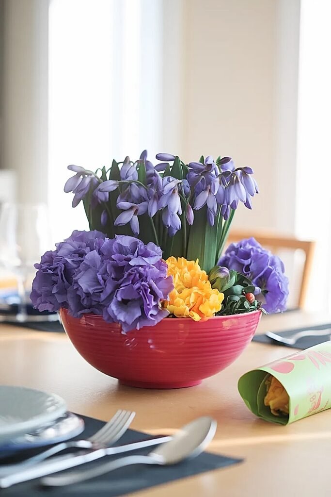 Divide bowl mentally into quarters, filling two opposite quadrants entirely with muscari while other two hold focal flowers. The alternating pattern creates rhythm while muscari sections provide fullness base. This works with color blocking, maybe purple muscari quadrants alternating with coral tulip quadrants. The sectioned approach creates modern graphic aesthetic while muscari fills what would otherwise be empty bowl areas.