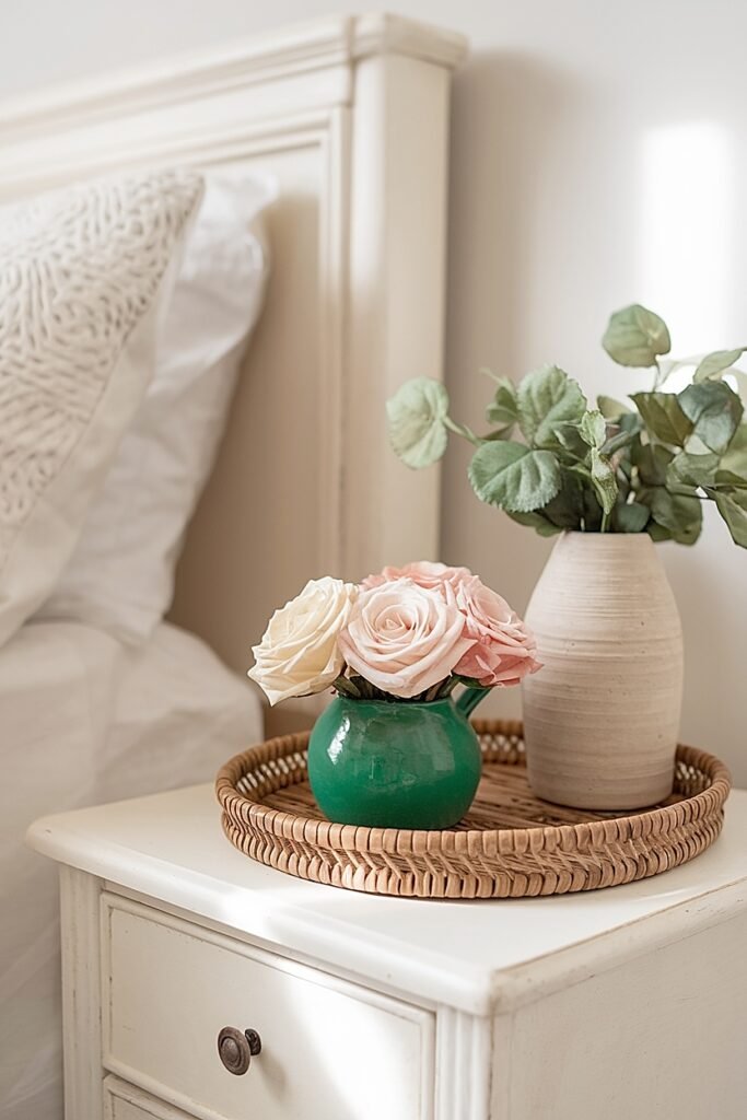 Choose a single modest vessel, a small green crock, a slender bud vase, a petite glass jar. Fill with one to three roses maximum. Position toward the nightstand’s back corner, leaving the front surface available for actual nightstand functions: phone charging, water glass, reading materials. The roses occupy the background rather than demanding center-stage attention.