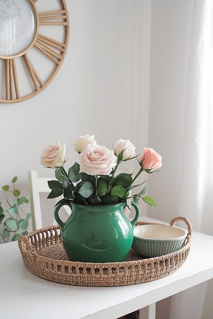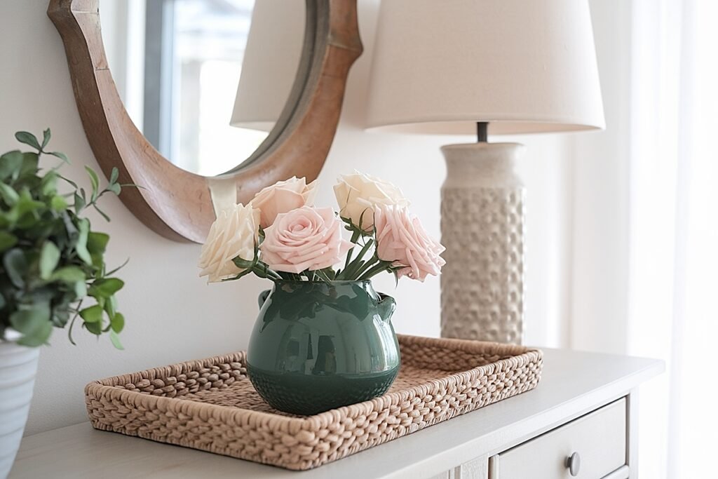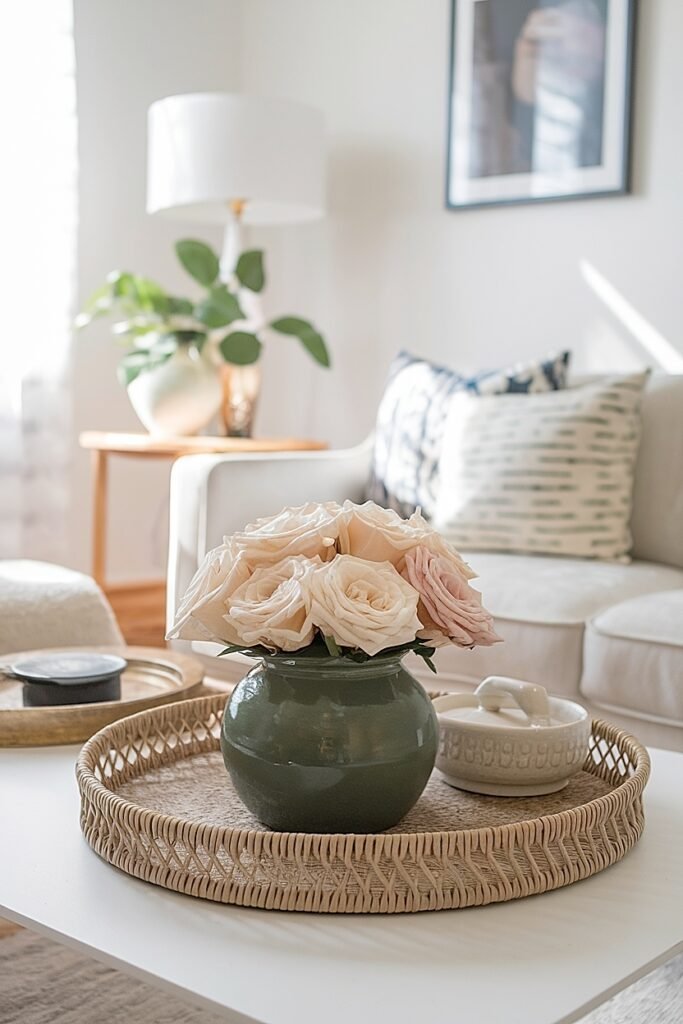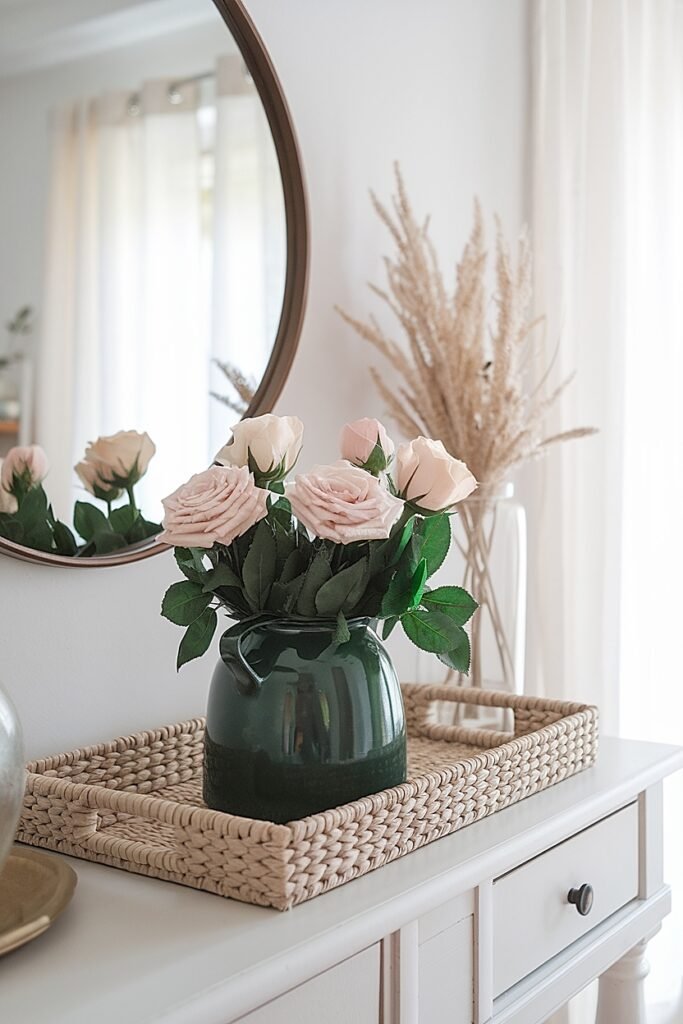 Select a rectangular tray and mentally divide it into decorative and functional zones. One half holds your rose arrangement in a compact green vessel. The other half contains a small dish for remotes and a coaster stack. The physical separation prevents decorative and practical items from intermingling messily. Both purposes coexist within tray boundaries, each serving its function without competing for dominance.