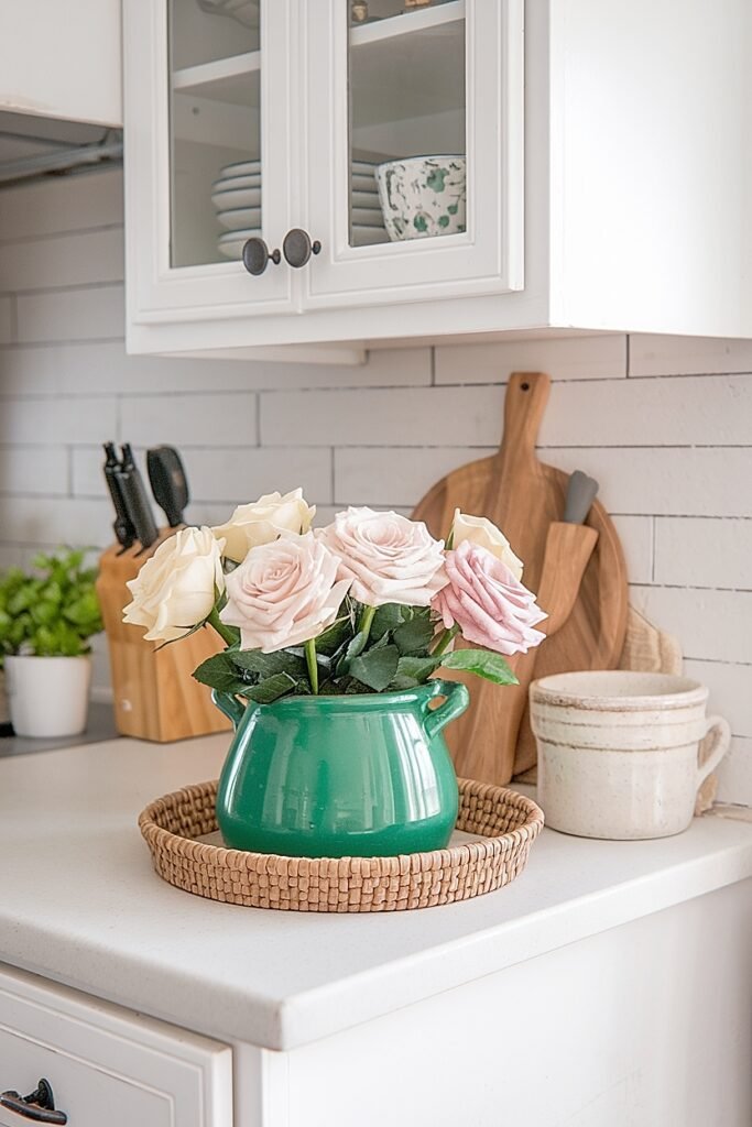 Counter corners where walls meet typically serve as dead space, too tight for prep work, too awkward for most storage. Claim this corner for a compact rose arrangement. The position removes flowers from active workspace while utilizing otherwise wasted real estate. A small green crock fits most kitchen corners perfectly.