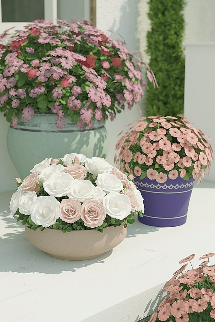Matte bowl (airflow) + terracotta minis kept shaded | Slight rose spacing for airflow + trimmed greens for support | Do: move minis to cooler corners. Avoid: heat-heavy zones. |