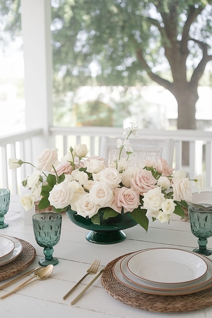 6. Floating Rose Bowl A wide, shallow bowl filled with water and floating rose heads creates elegant simplicity that works on any table size. The weight of the water prevents tipping, and the contained design doesn’t encroach on dining space.