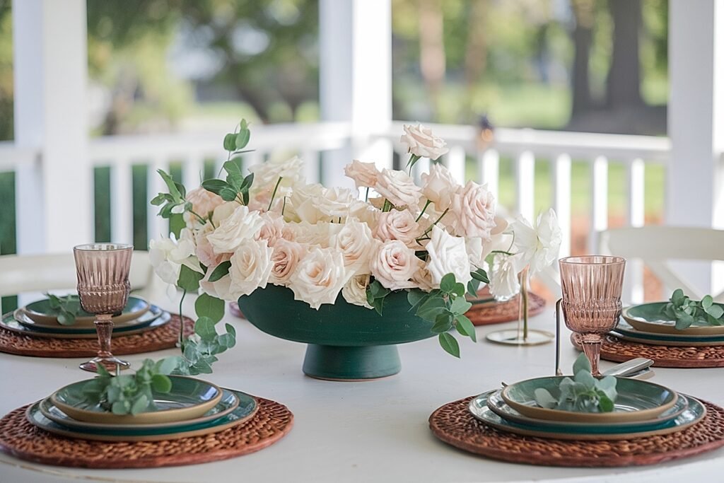 Not sure where to put roses outside without making the porch feel crowded? Use this quick guide to choose the right container, greens, and placement for each outdoor zone—then copy the exact checklist for your party day. It’s built for emerald + hunter styling with white and blush roses.