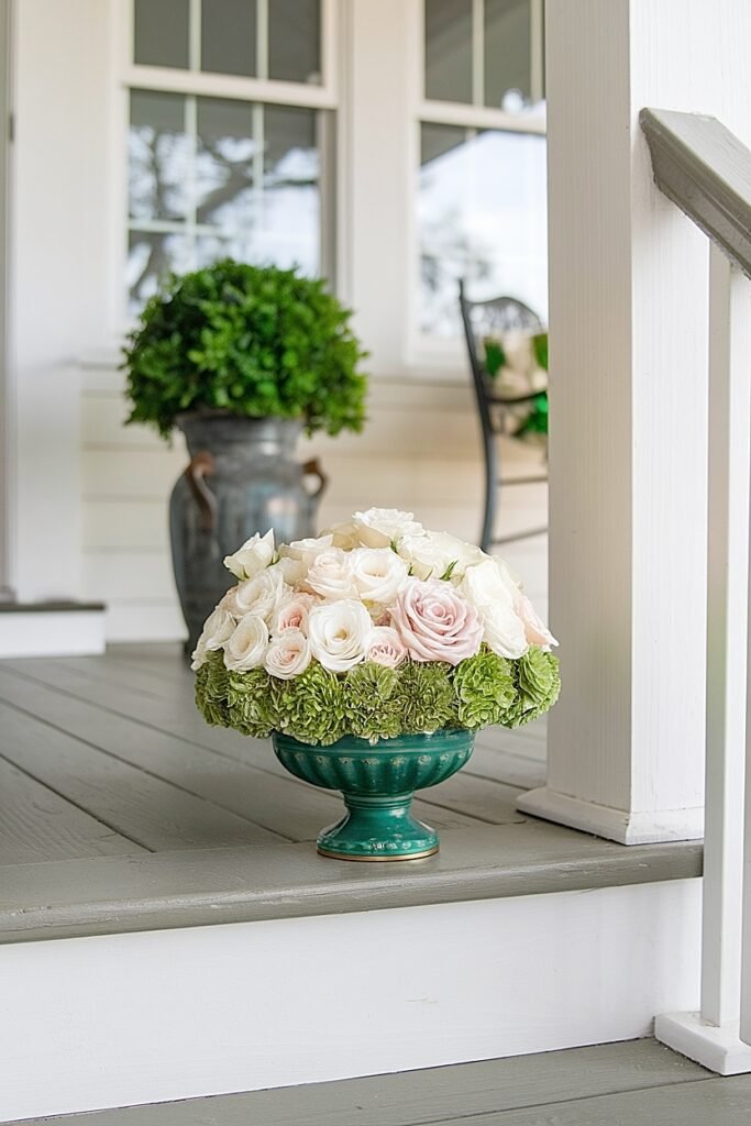1. Flanking Urn Statements Position matching substantial urns or planters on either side of your front steps, creating a welcoming gateway effect. Paint or wrap urns in Saint Patrick’s Day colors, then fill with abundant green and white roses mixed with trailing ivy that softens the container edges. The symmetrical placement reads as intentional and elegant from approaching viewpoints, while the large scale ensures visibility from the street. Weight containers heavily, these arrangements must resist being knocked over by every passing delivery person or gust of wind.