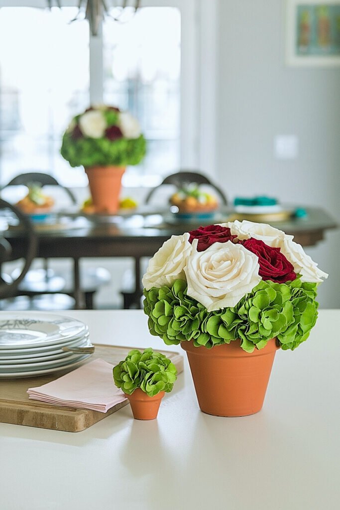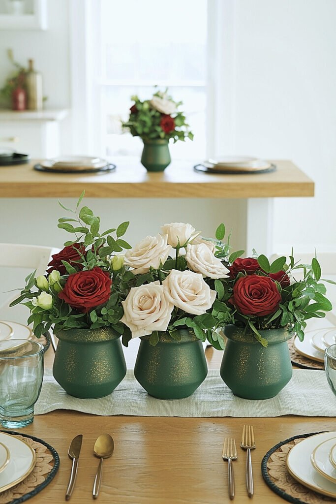 1. Graduated Trio with Mixed Greens Gather three pots in ascending sizes, perhaps four-inch, six-inch, and eight-inch diameters, and paint each a slightly different shade of green, from pale sage to deep emerald. Arrange them in a diagonal line down your table’s center, each filled with white roses and trailing ivy. The graduation creates visual movement while the varied greens add depth. This approach works especially well on rectangular tables where a single centerpiece might get lost in the length.