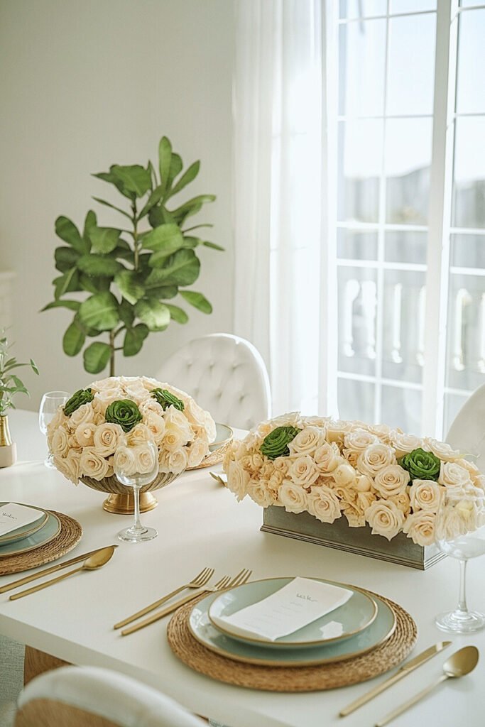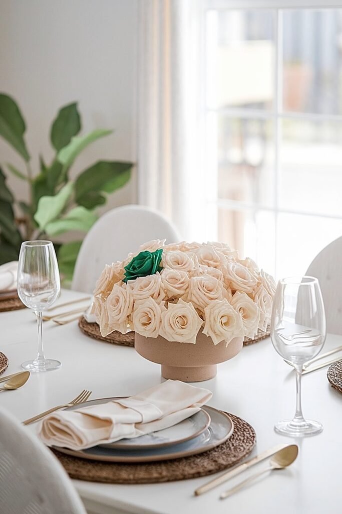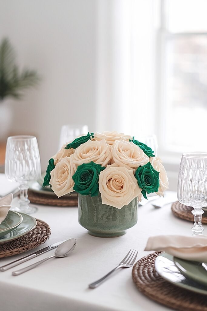 Start by creating a centerpiece you’d be proud to display any time of year. Beautiful roses in cream, white, or blush tones. An elegant vessel. Proper proportions for your table size. Only after achieving this baseline should you introduce your green hint. The sequence matters: building from neutral foundation prevents green from becoming structural.