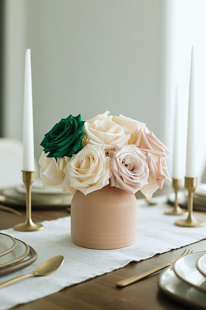 Run a low greenery garland along table center, positioning small rose clusters at intervals within the greenery. The garland provides continuous green, your St. Patrick’s reference, while roses at intervals add color punctuation. Keep overall height under three inches for this approach.