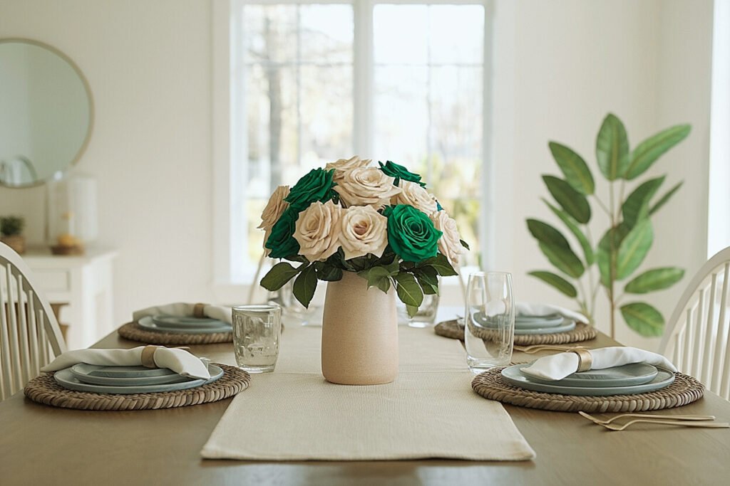 Dining table centerpieces operate under constraints other surfaces don’t face. Food must share the table. Conversation must cross it. Guests must comfortably use it. St. Patrick’s rose displays that ignore these realities become beautiful obstacles rather than enhancements.