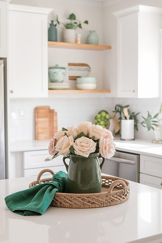 Position your rose arrangement at the peninsula’s terminal end, the point furthest from kitchen workflow. This end-cap placement creates visual anchor visible from living areas while occupying zero prep-relevant space. Use a substantial green crock sized to the peninsula’s width, filled with cream or white roses that complement green beautifully. The end position naturally separates decoration from function.
