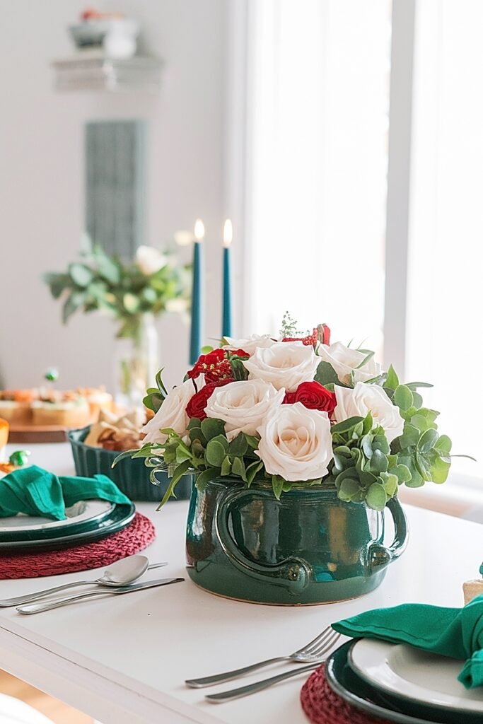 Select one substantial vessel rather than multiple modest ones. A single large ceramic crock, a generous glass cylinder, a weighty metal urn. The vessel’s quality and scale contribute significantly to expensive appearance. Green vessels in emerald or sage tones establish St. Patrick’s connection while avoiding the kelly-green cheapness of party store containers. Fill your chosen vessel completely, roses should touch each other, heads forming continuous coverage without visible gaps or stem exposure. This abundance reads as luxury regardless of actual investment. For apartment-friendly approaches using similar principles at smaller scale, explore these Saint Patrick’s Day small apartment rose decor ideas with tiny green accents that apply the same quality-over-quantity philosophy. Planning your party? Share this post with co-hosts!