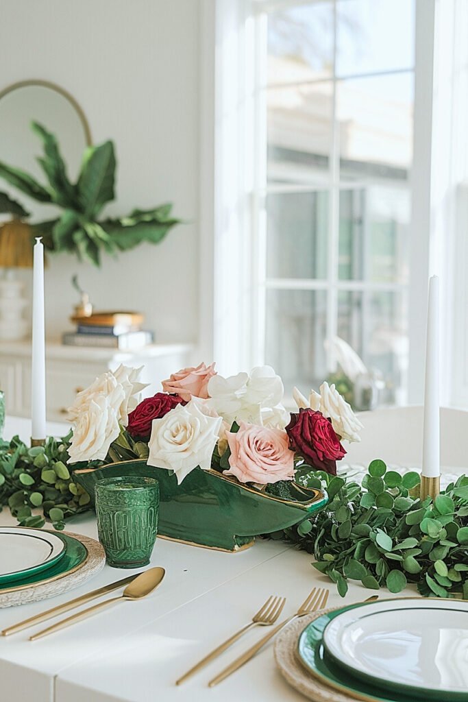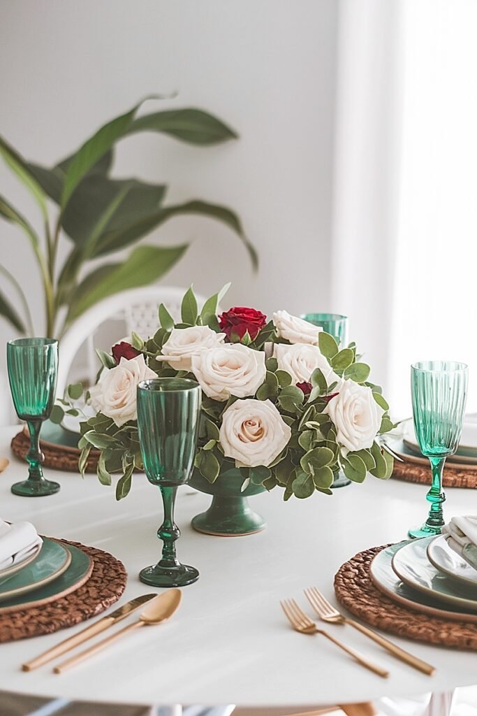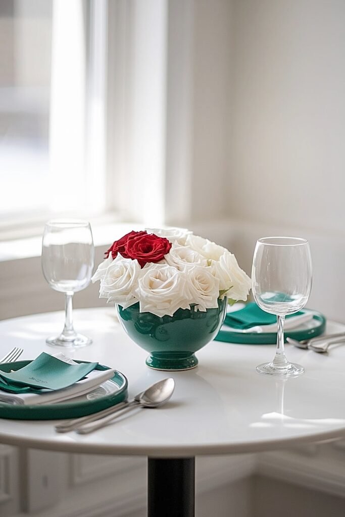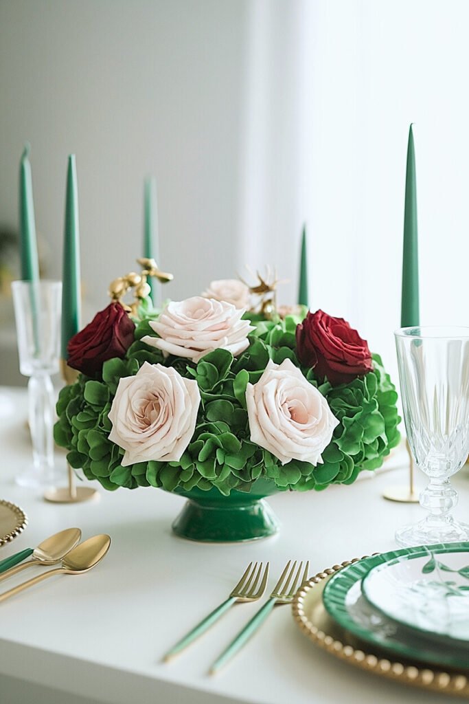 Build your arrangement as a dome or sphere, with roses graduated from center peak to lower perimeter. Work in rotation, turning the arrangement as you build to ensure equal coverage from all angles. Test by walking around the table during construction, each position should reveal approximately equal beauty. Position the completed arrangement at exact table center, equidistant from all place settings. For St. Patrick’s, add one green accent, a green candle beside the roses, a green napkin beneath the vessel, visible equally from all seated positions. The single accent communicates holiday intent; the roses carry the beauty.