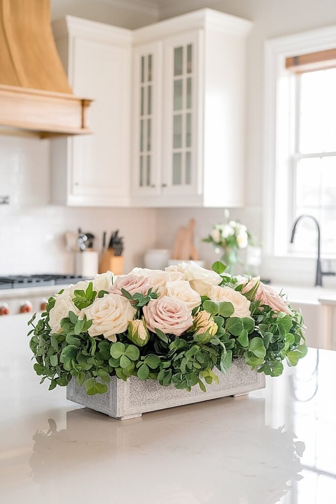 Ideas for a Saint Patrick’s Day Party Rose Centerpiece on a Kitchen Island