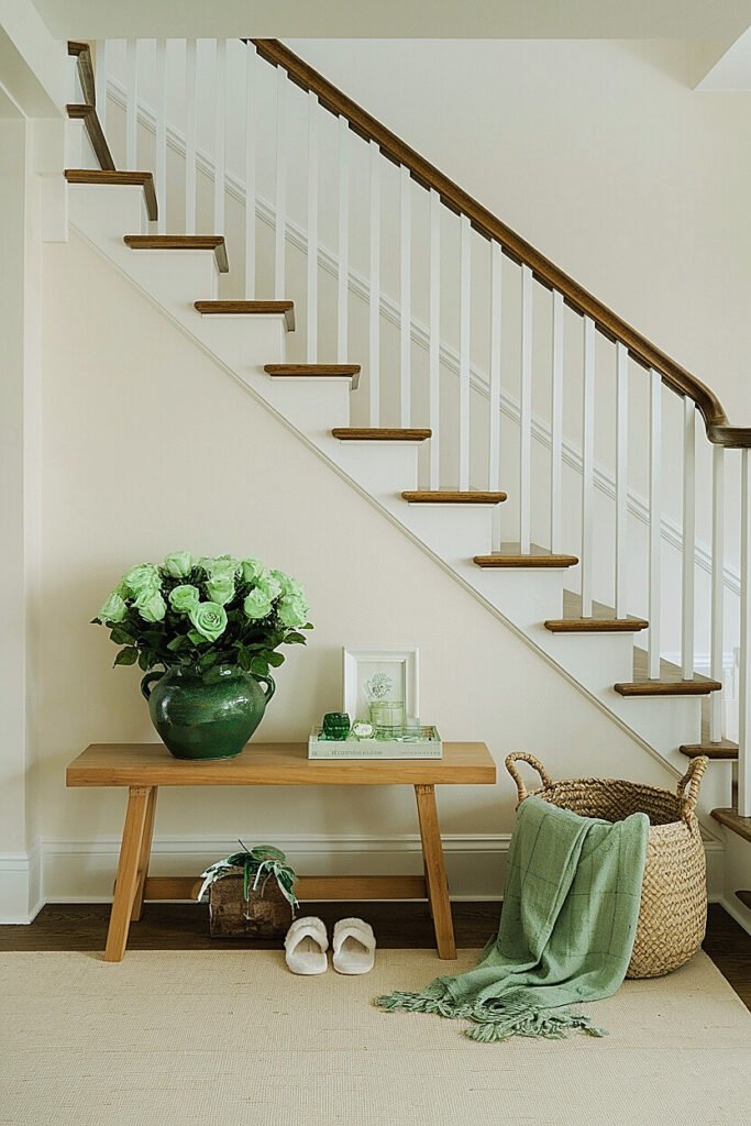 Stair landings offer decorating opportunities that main-floor spaces can’t replicate. The transitional nature, the multi-angle visibility, the natural pause point in vertical travel, all create conditions for memorable St. Patrick’s displays. The techniques throughout this guide, console styling, rail garlands, single-vase impact, bench integration, basket arrangements, sideboard layering, all leverage these unique landing qualities.
